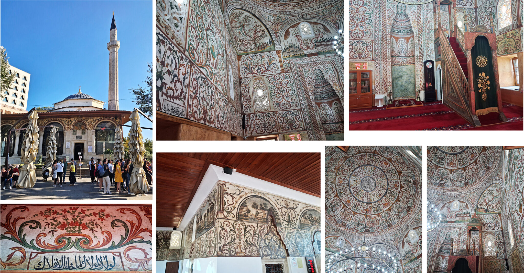 Nos dirigimos primero a la Mezquita de Et'hem Bey. Los Turcos Otomanos empezaron la conquista de la actual Albania en 1385, en 1431 la zona de Tirana ya era otomana y lo fue hasta 1912. Esta mezquita, conocida también como la Mezquita pintada, fue construida entre 1791 y 1821. Sigue el modelo de mezquita turca de planta centralizada con cúpula. Ésta es famosa por las pinturas que la decoran tanto por fuera como por dentro, que representan árboles, cascadas y puentes. Y también tiene decoración epigráfica.
