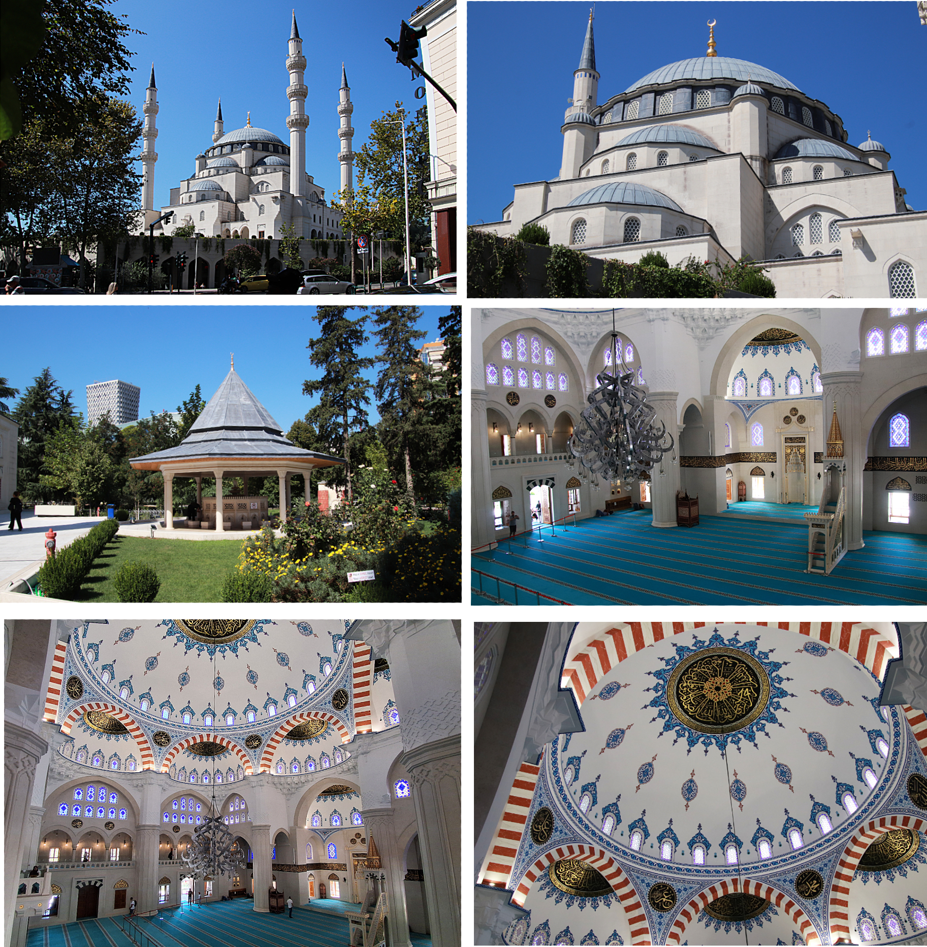 Seguimos hasta la mezquita Namazgjah, donde oímos la llamada a la oración (adhan) de mediodía. La construcción de esta mezquita empezó en 2015. De nuevo una construcción religiosa muy reciente. Recordemos que el régimen comunista prohibió la práctica de las religiones y destruyó muchos edificios religiosos, así que se comprende que se estén construyendo nuevos. Esta mezquita también sigue el modelo turco y, concretamente, nos recuerda mucho a la Mezquita Azul de Estambul. Es la mezquita más grande de los Balcanes y hay que destacar que tiene cuatro minaretes. Interesante también el juego de cúpula y semicúpulas que cubren la planta centralizada. Este juego de cúpulas se inspira en el que Antemio de Tralles e Isidoro de Mileto diseñaron para Hagia Sophia (532 a 537) bajo el reinado del emperador bizantino Justiniano I. Haghia Sophia era una iglesia bizantina transformada en mezquita tras la conquista de Constantinopla por los turcos otomanos (1453), no nos extraña, pues, que sea el modelo tanto para iglesias bizantinas como para mezquitas musulmanas y que lo reconozcamos tanto en la Península Balcánica como en Turquía e incluso en construcciones del Próximo Oriente que estuvieron bajo dominio otomano. La mezquita, obviamente, tiene todos los elementos habituales: minaretes, fuente para las abluciones, la sala de oración (haram), el nimbar (púlpito desde el que el imam hace la jutba («sermón») en la oración del viernes, el mihrab.