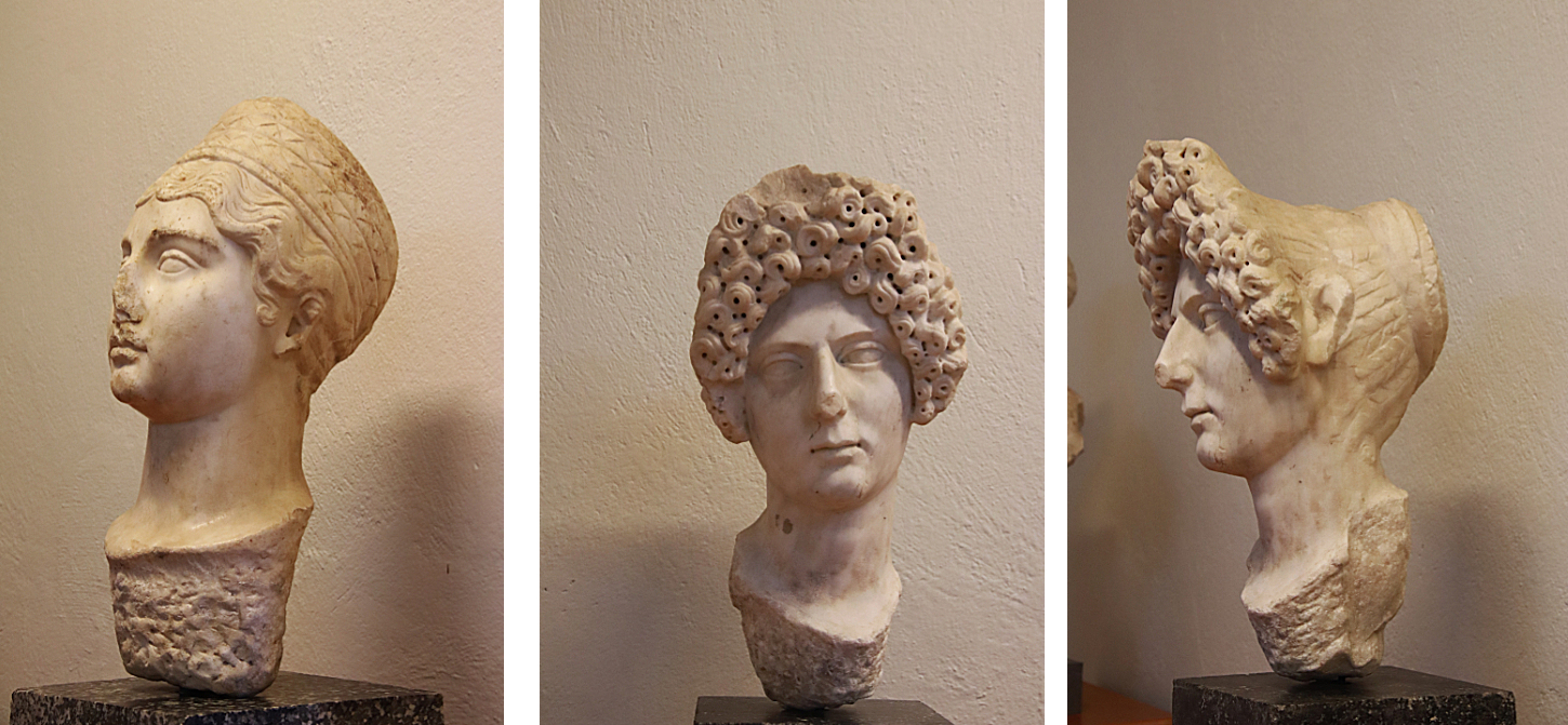 Unos retratos femeninos de época romana. Por un lado los maravillosos peinados que lucían las dominas romanas que nos permiten datar los retratos, está documentada la moda a lo largo de la historia de Roma. Y por otro lado ese trozo de mármol sin pulir que tienen debajo del cuello que nos habla de la práctica de hacer cuerpos en serie a los que se acoplaban las cabezas que eran retratos auténticos de la persona que representan.