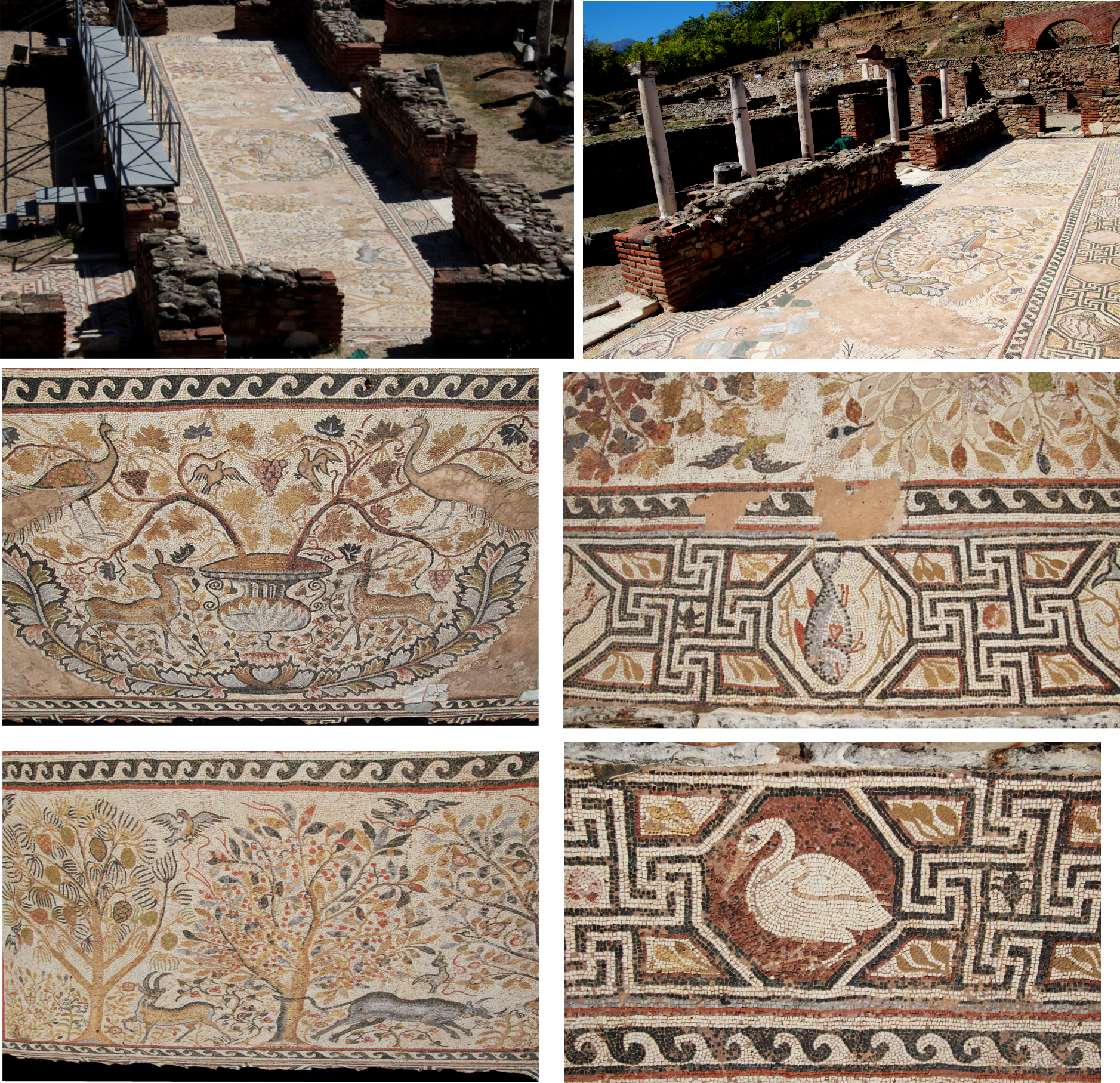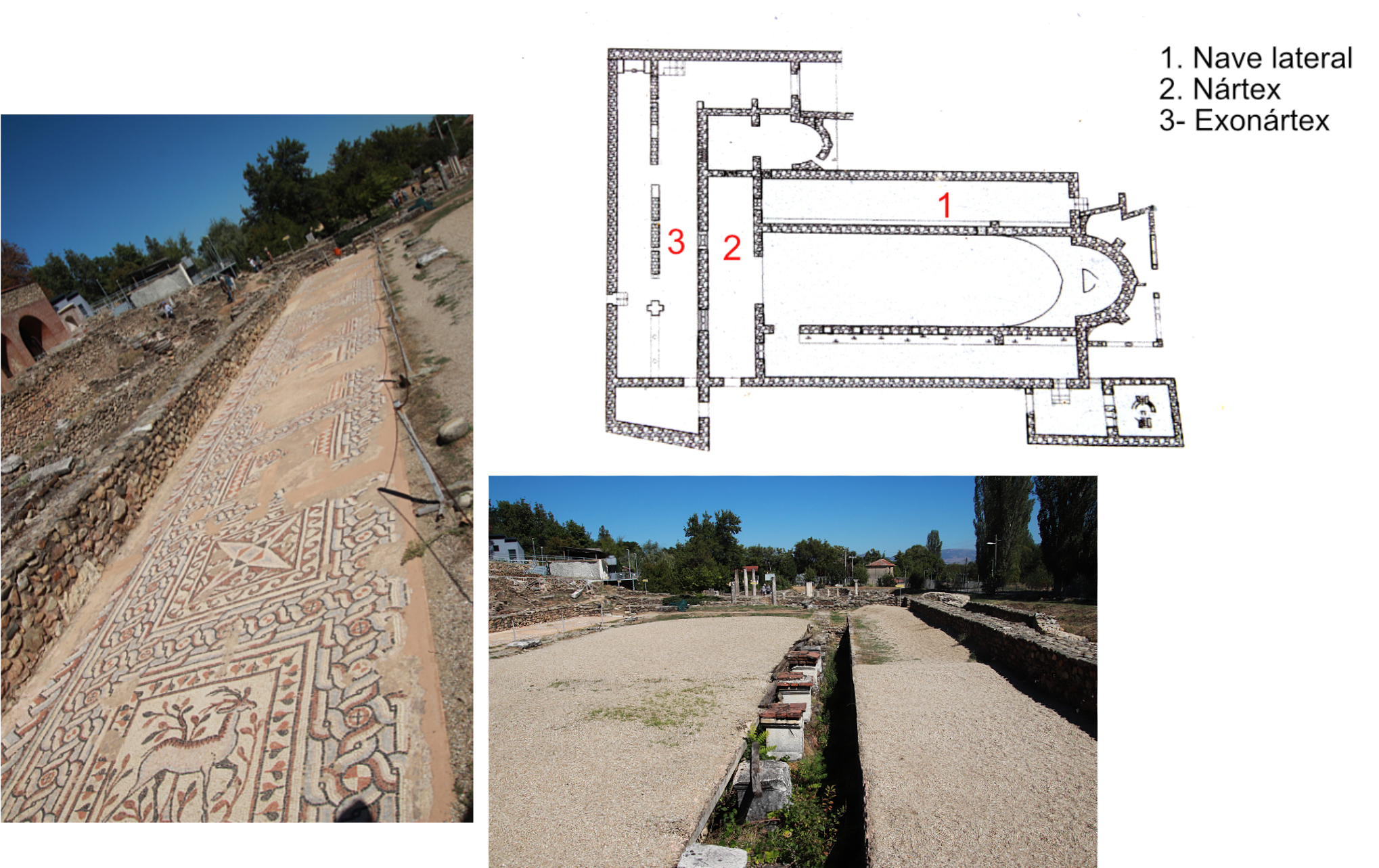El nártex está pavimentado con un mosaico en opus tessellatum de más de 100 m² con motivos geométricos, florales y figurativos que representa aves, árboles, arbustos y animales que simbolizan el Paraíso y la Creación. Está considerada una de las obras maestras del arte cristiano primitivo en los Balcanes.