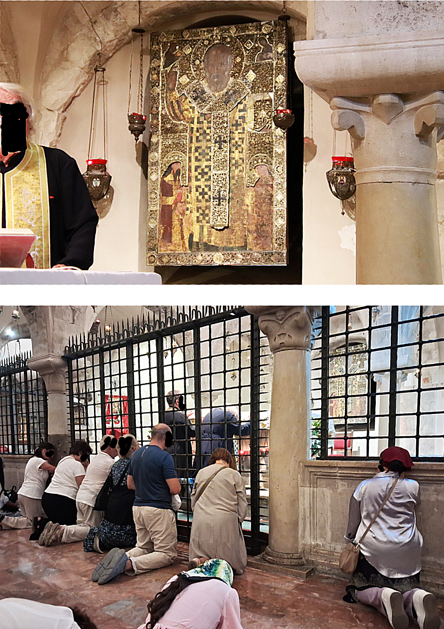 Pero uno de los elementos más interesantes es la existencia de dos altares: uno dedicado al ritual católico y el otro al ritual ortodoxo. La basílica es, como ya sabemos, un centro de peregrinación de gentes de todo el mundo, especialmente de cristianos ortodoxos, muy devotos de este santo. Y, efectivamente, allí hay un grupo de georgianos ortodoxos, que se han traído dos sacerdotes que están rezando según su rito. Nos quedamos un rato viéndolo y oyendo los curiosos cantos de los sacerdotes. Me sorprende que algunos se postran como los musulmanes, rezan arrodillados con la frente tocando el suelo, no lo había visto nunca en cristianos.