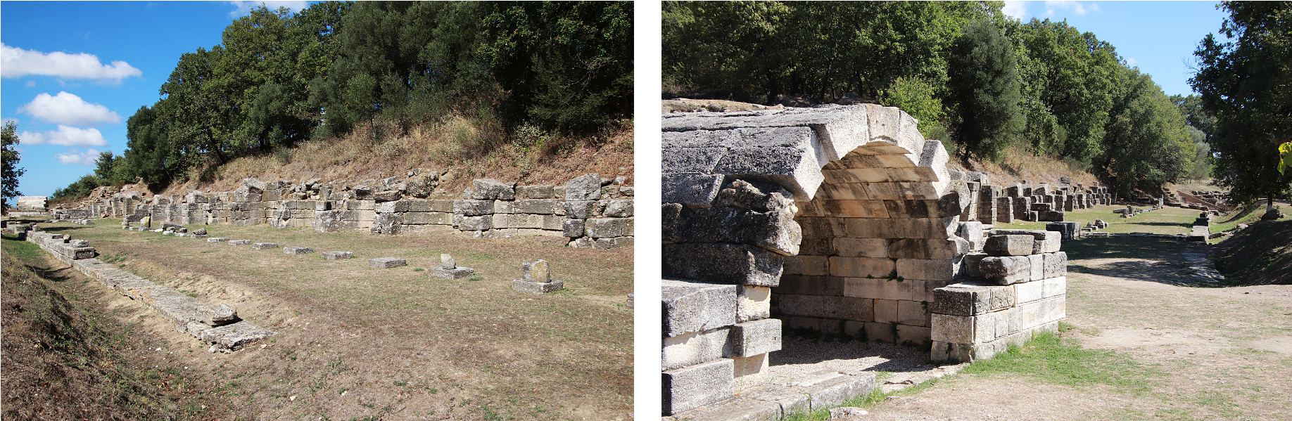 Entramos en el yacimiento y lo primero que vemos es el edificio que llaman Bouleuterion o Monumento de los Agonotetes. En el bouleuterion se reunía la Boulé, o sea el consejo de ciudadanos que aconsejaba a la Asamblea, en las ciudades griegas con un sistema democrático. La construcción data del siglo II a. C. La sala de reunión tenía forma semicircular, la fachada frontal del edificio tenia seis columnas de estilo corintio que sportaban el entablamento. Hoy en día, esta fachada con sus columnas es la parte más reconocible del monumento.