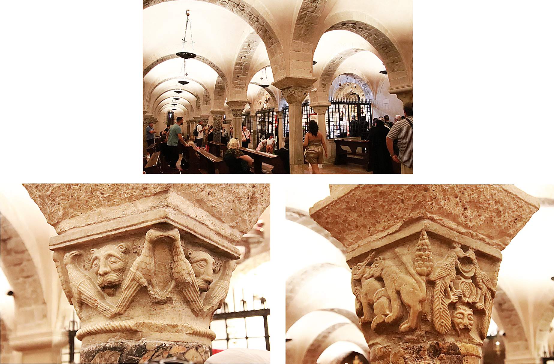 Bajamos a la cripta. Esta cripta se terminó en 1098, es la parte más antigua del templo. Elementos característicos de la cripta son los capiteles muy diferentes entre ellos.
