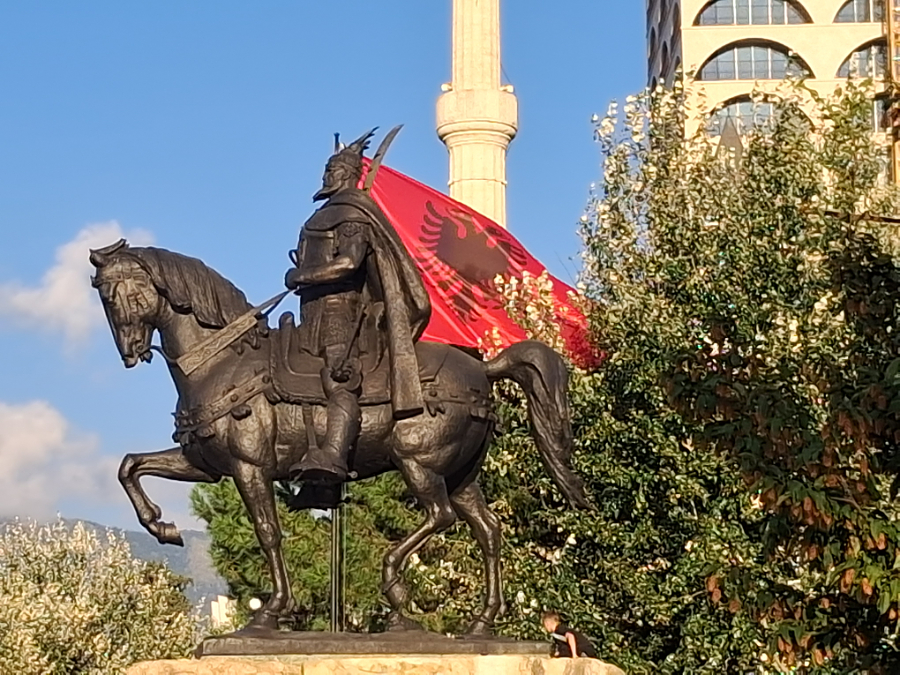 Cuando acabamos de verla volvemos al Hotel Baron. De camino al autobús volvemos a pasar junto a la estatua ecuestre de  Skanderbeg, cuyo nombre era Gjergj Kastrioti, un noble y comandante militar albanés del siglo XV, conocido por liderar la resistencia contra el Imperio Otomano durante casi 25 años, por lo que es considerado el héroe nacional de Albania.