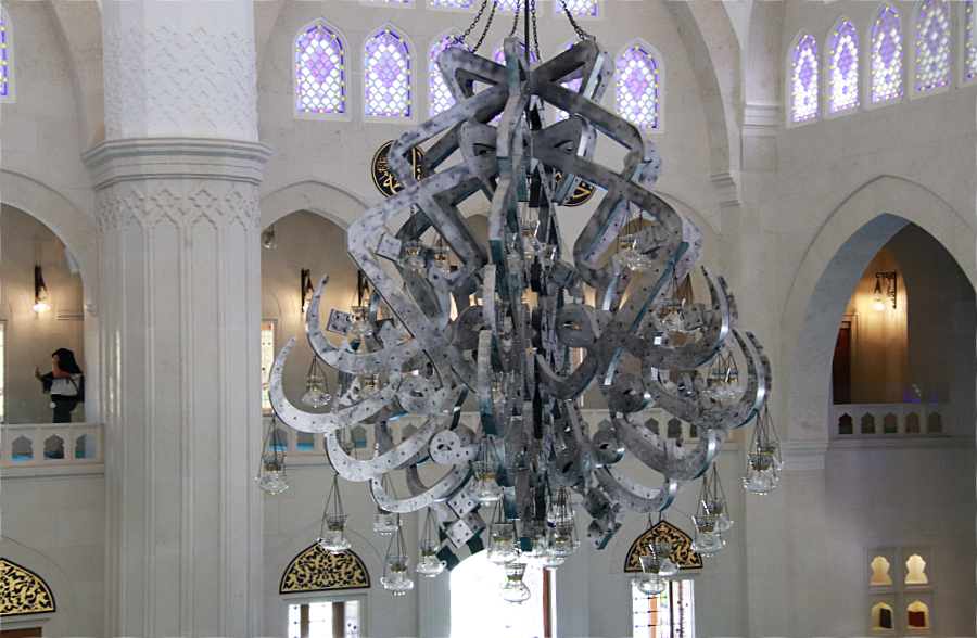Y del centro de la cúpula cuelga una enorme lámpara que me recuerda las bonitas caligrafías otomanas pero que no puedo leer