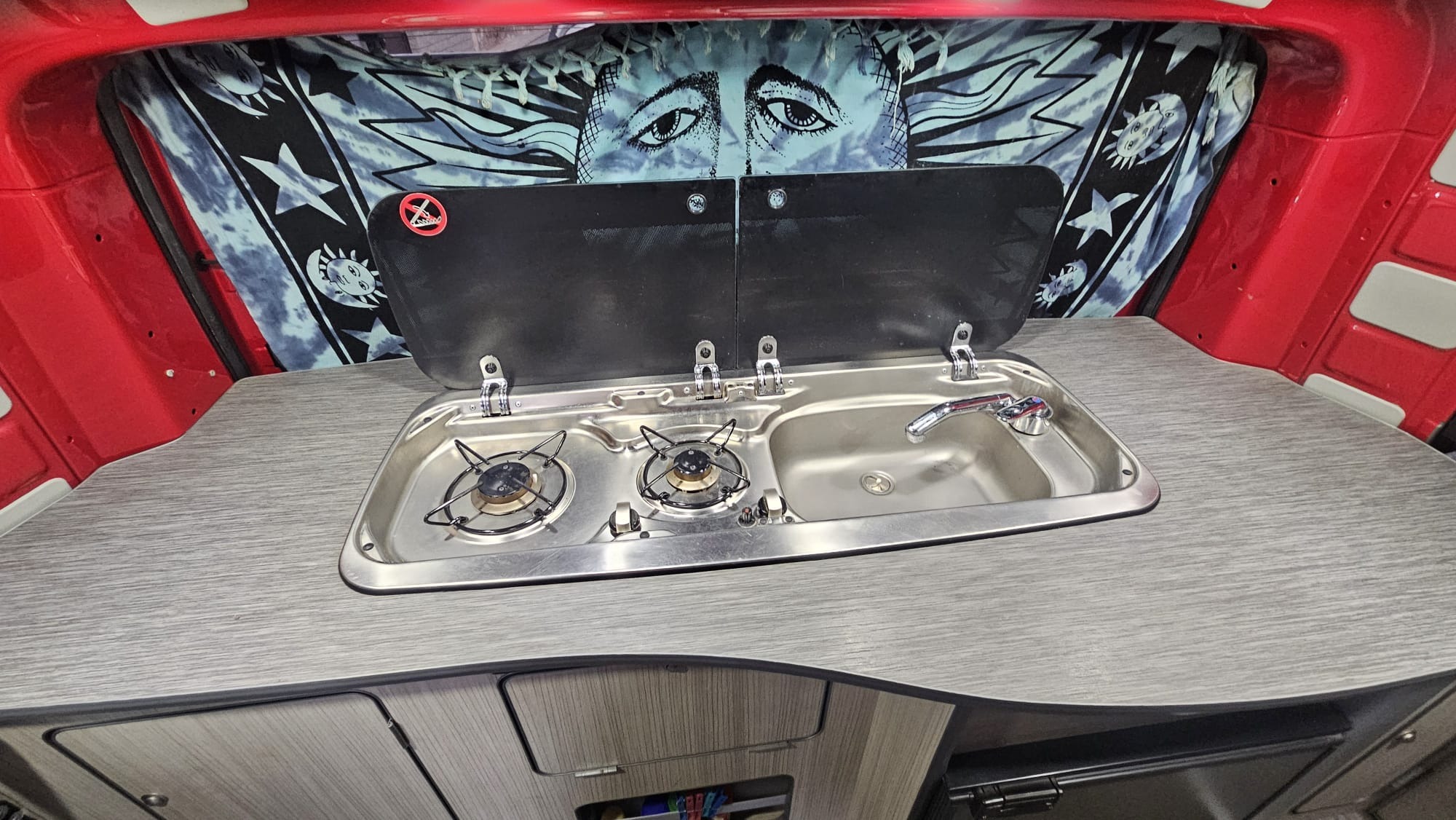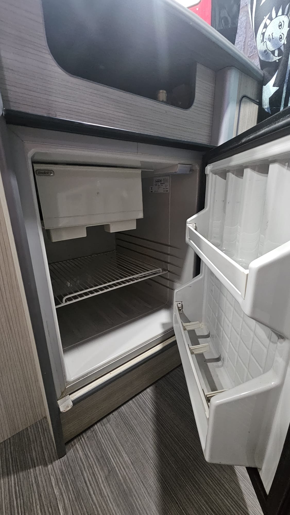- Mueble trasero con módulo cocina dos fuegos + fregadero, modelo Snew, nevera electrica 50l con congelador Indel B, y depósitos integrados.
