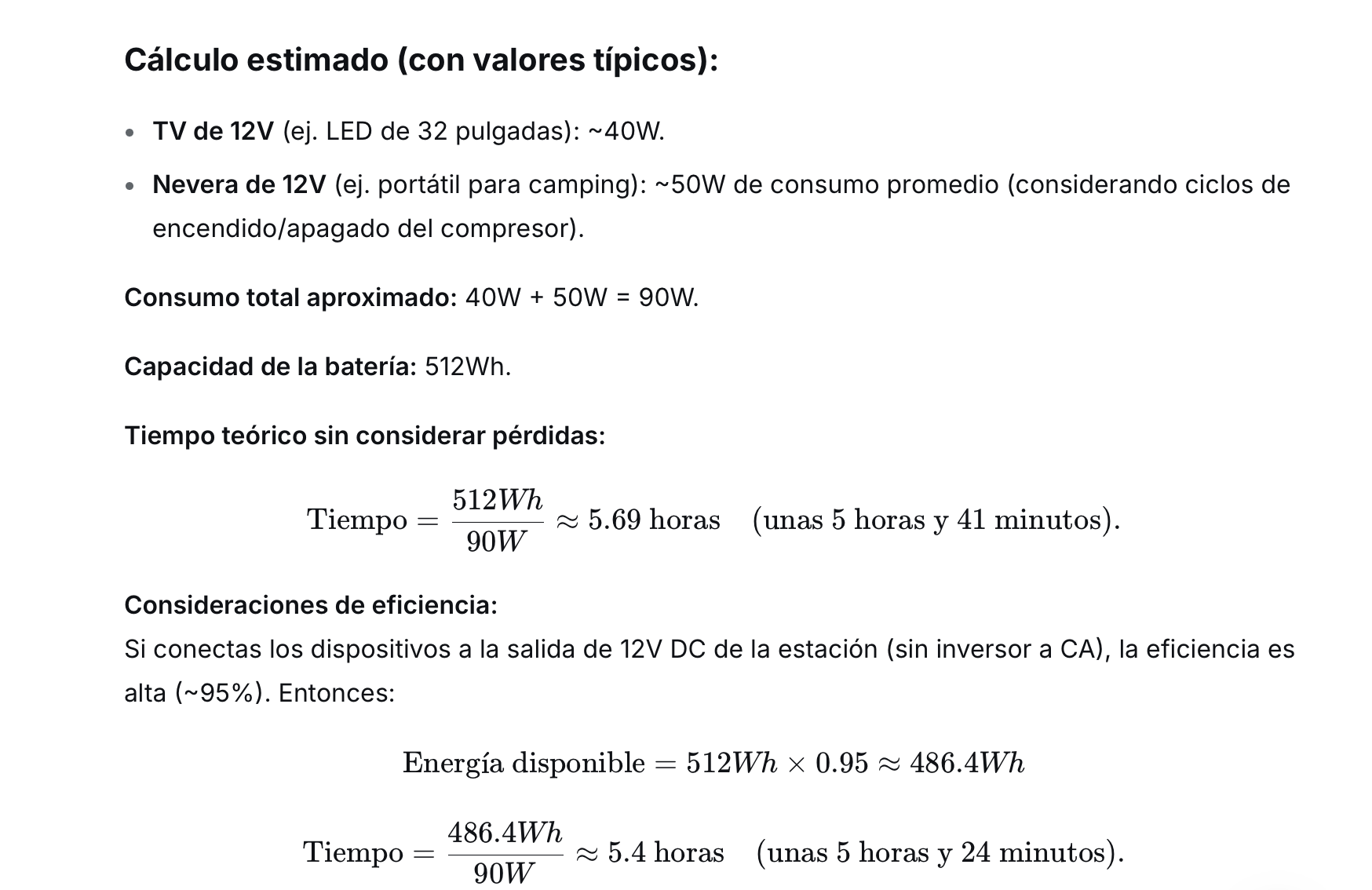 Para simplificar, asumiré que la TV y la nevera se conectan a la salida de CA de la estación, y que la estación convierte la energía de la batería a CA con cierta eficiencia. Pero la capacidad de la batería ya está en Wh, por lo que si conozco el consumo en vatios, puedo calcular el tiempo.